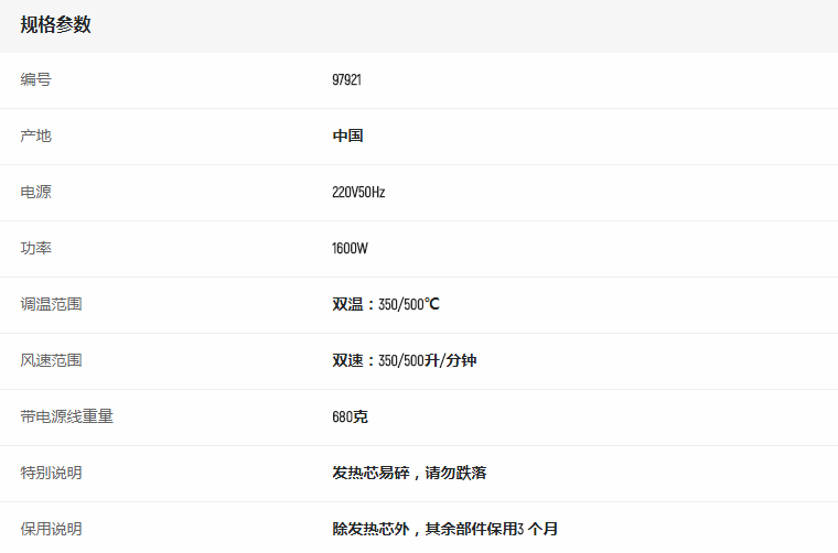 ◆雙重保護:雙重絕緣保護,更安全 ◆過熱保護:特有的過熱保護裝置確保加熱原器件正常運轉(zhuǎn) ◆100% 出廠檢驗:出廠前所有產(chǎn)品通過實際運行檢驗 ◆核心部件全部進口:加熱、供風等核心部件全部進口,品質(zhì)更能保證 ◆特別的支架設(shè)計:操作簡單、方便 ◆歐洲設(shè)計、歐洲技術(shù)、上海組裝 ◆個別應(yīng)用所需風嘴請根據(jù)實際情況另購 ◆發(fā)熱芯易碎,請勿跌落