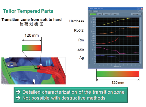 模壓淬火熱成形無損檢測:模壓淬火工藝中,待成形的鋼板在連續(xù)爐內(nèi)被加熱至約950C,即奧氏體化溫度。然后通過傳送工具(如機器人),將熾熱的薄板放入裝有特殊水冷系統(tǒng)的壓淬機床。隨著壓淬模具的閉合,材料發(fā)生變形。同時,冷卻系統(tǒng)在幾秒鐘內(nèi)的瞬間帶走鋼板的熱量。急速冷卻導(dǎo)致鋼板形成馬氏體微觀結(jié)構(gòu),確保材料同時具有高強度和硬度。 經(jīng)過預(yù)先標定,3MA無損測量技術(shù)建立逼近函數(shù),即工作曲線,確定目標質(zhì)量特征與3MA測量值的相關(guān)性。不但涵蓋目標變量的所有范圍,而且消除各種干擾(如溫度、厚度、物料批次)造成的預(yù)期變化。汽車車身的模具沖壓熱成形部件的常見檢測參數(shù):