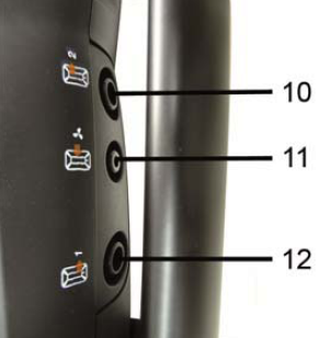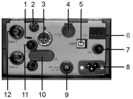 1 數(shù)據(jù)總線終端滑動(dòng)開關(guān) 2 助燃空氣溫度檢測傳感器 3 煙氣探頭 4 傳感器輸入 5 USB 2.0 6 觸發(fā)器輸入 7 稀釋氣體入口(量程擴(kuò)充用) 8 電源接口,100...240 V AC,50...60 Hz 9 直流電壓輸入11…40 V DC(選配) 10 氣體通道蓋板(僅用于維護(hù)目的) 11 壓力檢測端口p+和p- 12 數(shù)據(jù)總線 |