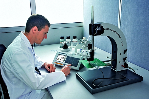 用Couloscope CMS2和支架V18測(cè)量印刷電路板上剩余純錫的厚度。