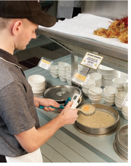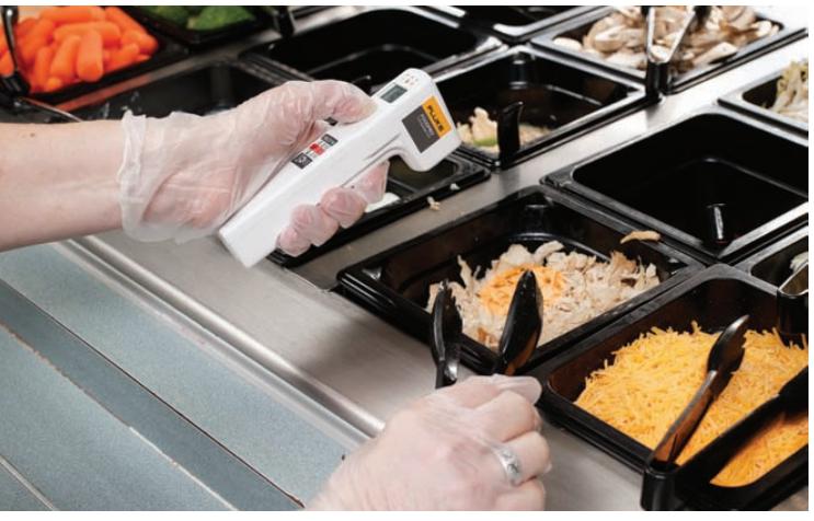 使用紅外溫度計,可簡單地掃描并準確地測出陳列于熱陳列區(qū)或冷陳 列區(qū)食品的表面溫度,如上開蓋的冷柜裝置、蒸汽桌、沙拉吧、新鮮 肉類或魚類陳列柜及加熱烤爐等處。使用 HACCP 的檢查功能可通過緩慢掃過食品表面、存放容器、熟 食箱內(nèi)的食品等等,可快速檢查出 HACCP 的危險溫度。溫度范圍 4 °C 到 60 °C(39 °F 到 140 °F)。 注意 如果溫度讀數(shù)在 HACCP 的危險溫度邊界 ± 1 °C (± 2 °F) 范圍,或?qū)y量讀數(shù)有懷疑,應用探針去檢查內(nèi)部溫度。