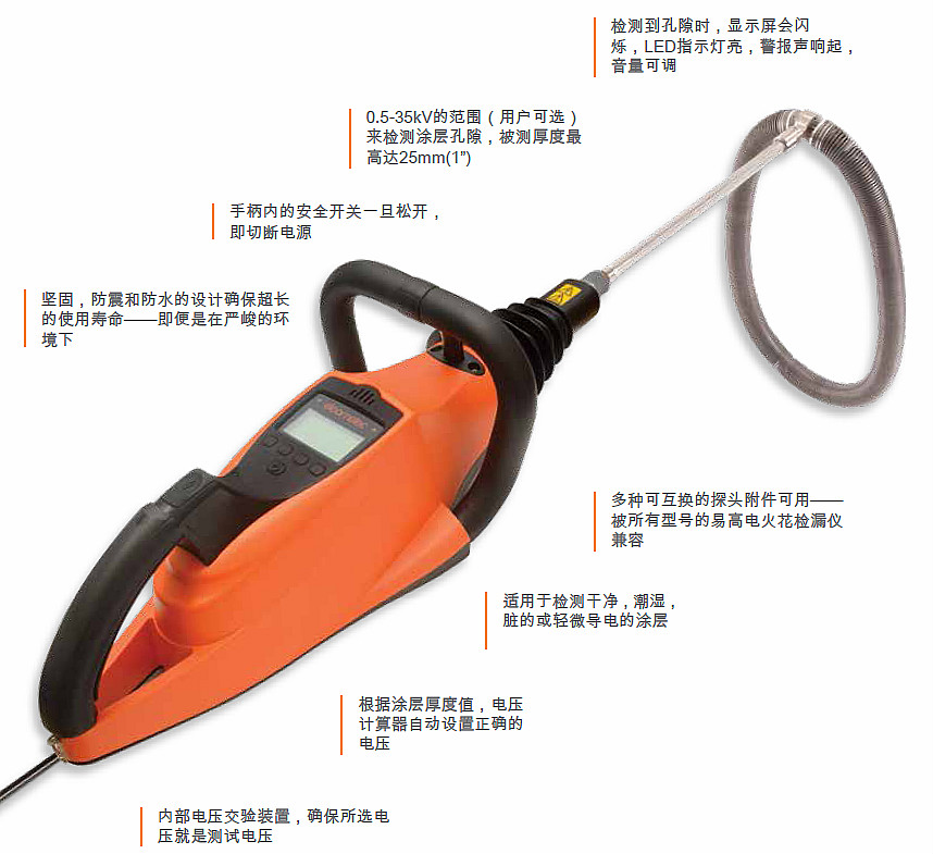 ? 0.5-35kV的范圍(用戶可選)來檢測涂層孔隙,被測厚度*高達25mm(1")