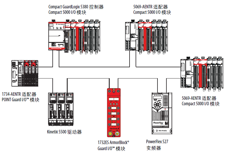 EtherNet/IP 網(wǎng)絡(luò)上的 Compact GuardLogix 5380 系統(tǒng)示例: