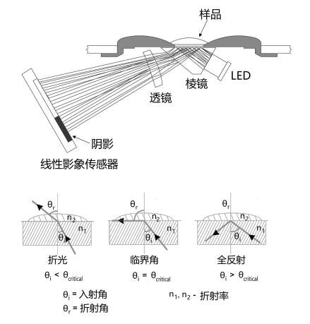 利用物質(zhì)對光的折射特性而設(shè)計,光在由-種介質(zhì)傳播到另一種不同的介質(zhì)中時 ,由于折射率的不同會發(fā)生路線的改變;使用LED讓光通過與樣品接觸的棱鏡,再使用圖像傳感器檢測到光線不再通過樣品折射的臨界角。然后使用專門的算法將溫度補償,應(yīng)用于測量,并將折射率轉(zhuǎn)換為指定的參數(shù)