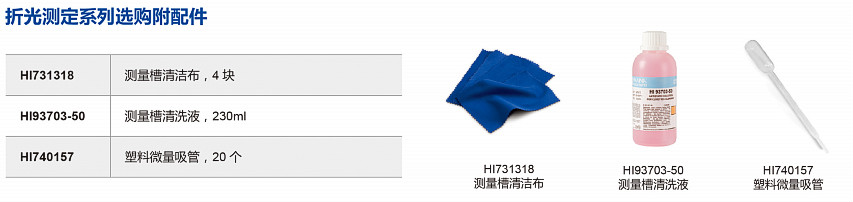HI96821D:主機,HI70436M 定制專用去離子水(規(guī)格:230mL),HI740157P 專用微量塑料吸管(規(guī)格:20個/組),HI731318專用清洗布(2塊),中英文使用說明書,HI721006專用攜帶箱。
