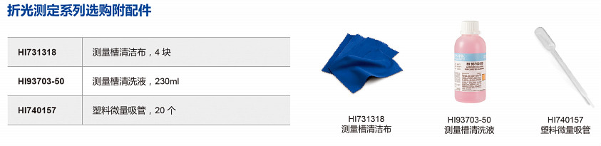 HI96822:主機,HI731318專用清洗布(2塊),中英文使用說明書,HI721006專用攜帶箱【溫馨提示:為了確保測量數(shù)據(jù)精準度,首次購買該款儀器時,訂購HI70436定制專用去離子水,用于儀器校準,訂購HI740157P專用微量塑料吸管,用于去離子水和待測樣品的提取,避免交叉污染】