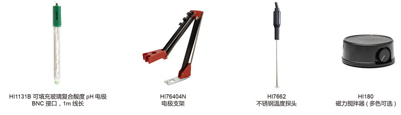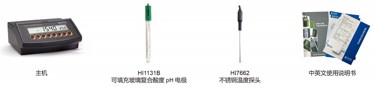 ②HI2216-03主機,標(biāo)配不含電極,HI7662 不銹鋼溫度探頭,酸度標(biāo)準(zhǔn)緩沖液套裝(標(biāo)準(zhǔn)值@25°C:4.01pH、7.01 pH 和常規(guī)電極清洗液,規(guī)格:20mL×3),HI76404N 定制專用電極支架,HI710006 AC230V/12VDC 電源適配器,中英文使用說明書