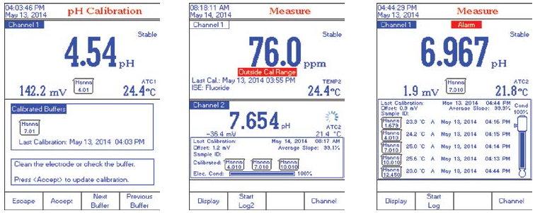 用戶根據(jù)需要可白定義設(shè)置顯示界面??稍O(shè)定基本模式和GLP管理模式以及實時圖表顯示,背景色也可選擇。兩個通道測量數(shù)據(jù)可分屏同時顯示??纱鎯虿殚喍噙_(dá)10種自定義檔案,即用戶自定義設(shè)定包括︰模式、標(biāo)準(zhǔn)點、等電位點、ISE測量單位和ISE電極型號(僅HI5522 )、溫度單位、解析度等信息。用戶更換測量項目,采用已設(shè)的自定義檔案功能,可大大節(jié)省測量時間。