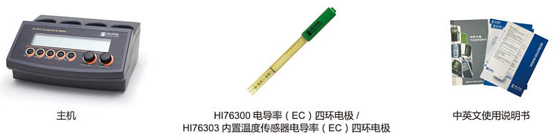 HI2315主機,HI76303 內(nèi)置溫度傳感器的四環(huán)電導率-EC電極,HI76404 定制專用電極支架,HI710006 AC230V/12VDC 電源適配器,中英文使用說明書