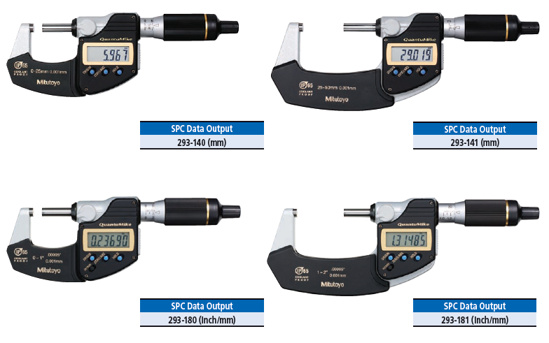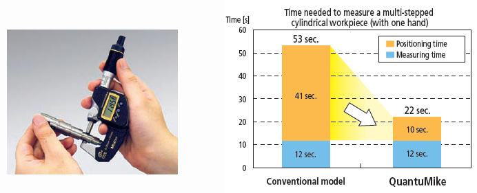 QuantuMike(快進(jìn)千分尺)293系列—IP65防冷卻液千分尺,進(jìn)給速度達(dá)到2mm/rev采用粗螺紋, 心軸進(jìn)給速度達(dá)到2mm/rev (非標(biāo)準(zhǔn)的0.5mm),測(cè)量速度得以提高。由于新高精度螺紋切割和測(cè)試技術(shù),使螺距的增加成為可能。試驗(yàn)表明,與傳統(tǒng)千分尺相比,定位時(shí)間和測(cè)量時(shí)間可分別降低60% 和35%*。三豐公司棘輪套管測(cè)力裝置可保證測(cè)量結(jié)果的重復(fù)精度。將測(cè)微螺桿軸向的微振動(dòng)傳輸至測(cè)量面,以提供恒定的測(cè)力,實(shí)現(xiàn)與工件的良好接觸。定壓作用既來(lái)自套管也來(lái)自限速器,因此,定壓裝置非常易于使用,即使在單手測(cè)量時(shí)??赏ㄟ^(guò)聲音確認(rèn)加壓狀態(tài),限速器可實(shí)現(xiàn)測(cè)量懸殊尺寸時(shí)所需要的快速測(cè)微螺桿進(jìn)給。有一系列的便捷的接口輸入工具,能使測(cè)量數(shù)據(jù)轉(zhuǎn)換成鍵盤信號(hào),或者直接把他們輸入到現(xiàn)成的電子制表軟件中的單元格中如Excel。本品優(yōu)異的防油、防水、防塵功能(塵/ 水防護(hù)等級(jí)達(dá)到IP65 防護(hù)等級(jí)) 使其可用于包括冷卻液濺灑的加工環(huán)境。