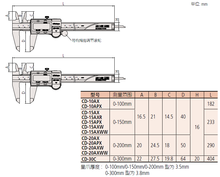 | 500-158-30 | CD-15AXR | 0 - 150mm | ?1.9mm 桿 | 帶有拇指調(diào)節(jié)滾輪 | —— |