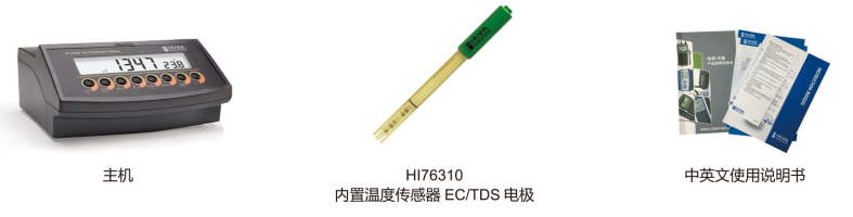 HI2300主機(jī),HI76310 內(nèi)置溫度傳感器四環(huán)鉑金EC/TDS電極,電導(dǎo)率標(biāo)準(zhǔn)緩沖液套裝(廠家隨機(jī)進(jìn)行配置標(biāo)準(zhǔn)值@25°C:1413 μS/cm和12880 μS/cm ,規(guī)格:20mL×2),HI76404N 定制專用電極支架,HI710006 AC230V/12VDC 電源適配器,中英文使用說明書