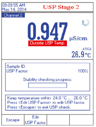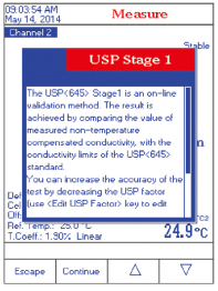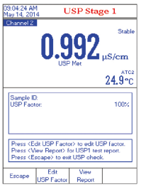 屏幕顯示詳細(xì)的操作信息,按照USP<645 >測(cè)量規(guī)范進(jìn)行電導(dǎo)率三步檢測(cè)分析, 確定電導(dǎo)率是否符合USP<645>規(guī)范標(biāo)準(zhǔn),每個(gè)測(cè)試步驟隨屏?xí)@示操作指南,指導(dǎo)用戶逐步完成操作,自動(dòng)檢測(cè)溫度、電導(dǎo)率、穩(wěn)定性是否在USP<645>的規(guī)定范圍內(nèi)。儀器存儲(chǔ)USP 多達(dá)200 個(gè)測(cè)量報(bào)告。
