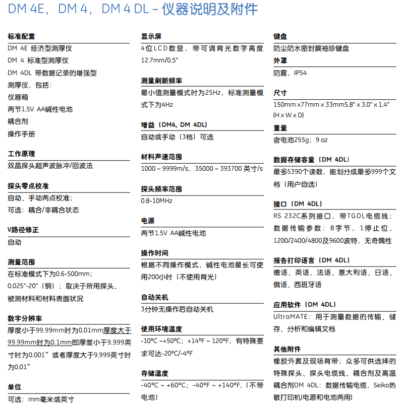 DM 4E、DM 4與DM 4DL滿足您超聲波厚度測量的一切所需。它僅重225克,外形小巧,只有幾個(gè)按鍵,專為單手操作而設(shè)計(jì)。DM 4E能幫助你完成大量的測厚任務(wù),尤其是磨損部件剩余壁厚的測量。