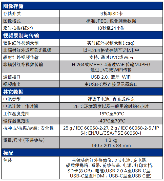 帶鏡頭的紅外熱像儀、 2節(jié)電池、充電器、硬質(zhì)便攜箱、系帶、前鏡頭蓋、電源、打印文檔、SD卡(8 GB)、電纜(USB 2.0 A至USB-C型、USB-C型至HDMI、 USB-C型至USB C型)