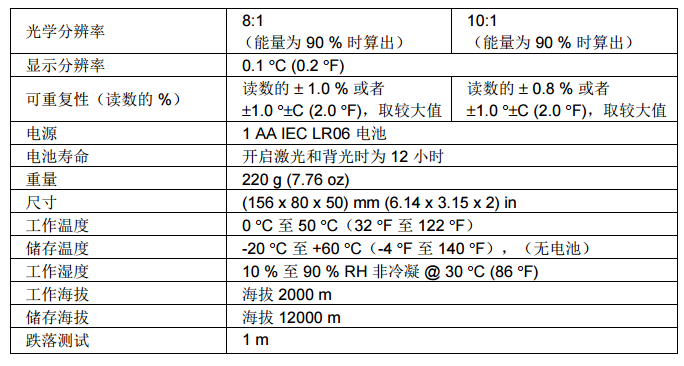 主要特性: 采用精密激光技術(shù),使測量更準(zhǔn)確并可重復(fù)測量 帶背照燈的 LCD 大型顯示屏便于用戶查看和讀取信息 輕型小巧的設(shè)計便于將儀器裝入工具箱 MT4 MAX:8:1 的距離與光點尺寸比 MT4 MAX+: 10:1 的距離與光點尺寸比 IP40 防護等級提供額外的保護 顯示*小、*大或平均溫度,或兩次測量值之間的差值 高溫和低溫警報,可快速顯示超出限制的測量值 電源為一 (1) 節(jié) AA 電池 保修一年 |