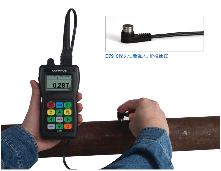 27MG的標(biāo)準(zhǔn)配置帶有經(jīng)濟(jì)實(shí)用的D7910雙晶探頭,用戶使用這款探頭可以完成很多基本腐蝕應(yīng)用的測(cè)厚操作。Olympus還備有種類齊全的雙晶探頭系列產(chǎn)品,可以對(duì)很薄、很厚的材料,或小直徑管件進(jìn)行測(cè)量。與27MG兼容的Olympus探頭帶有自動(dòng)探頭識(shí)別功能,可通過(guò)自動(dòng)調(diào)用默認(rèn)V聲程校正的方式,優(yōu)化探頭的性能。27MG的設(shè)計(jì)目的是幫助檢測(cè)人員和維護(hù)工程師對(duì)那些內(nèi)壁容易受到腐蝕的金屬管道、箱罐、梁柱及結(jié)構(gòu)管板的壁厚變化進(jìn)行監(jiān)控。超聲測(cè)厚儀從被測(cè)材料的外側(cè)發(fā)射聲波,無(wú)需損壞工件,即可快速實(shí)施性價(jià)比高的檢測(cè)方案。