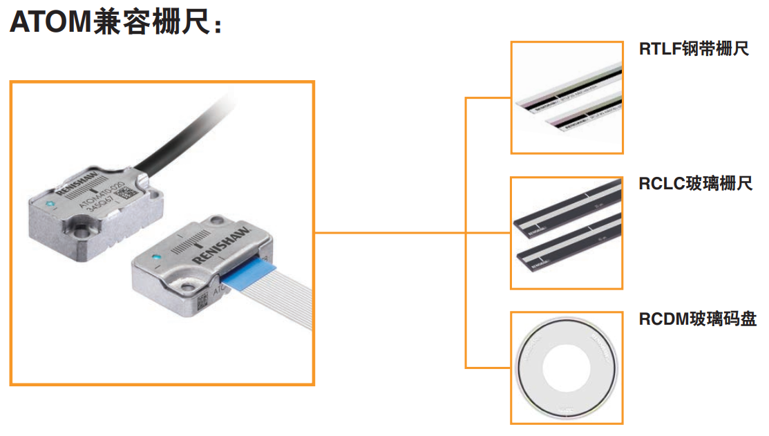 ATOM提供高柔性線纜和柔性印刷電路 (FPC) 兩種輸出類型,并有20 μm和40 μm柵距的柵尺可供選擇。提供一系列配用的接口,包括標準Ri接口、高性能Ti接口和緊湊型無封裝ACi接口。