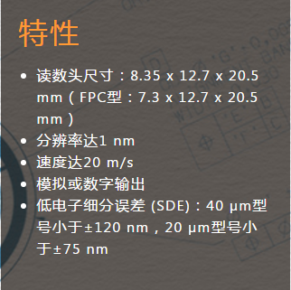 提供20 μm或40 μm兩種柵距類型,有多種尺寸可選(20 μm:?30 mm至?108 mm,40 μm:?17 mm至?108 mm) 非接觸形式消除了傳統(tǒng)封閉式光柵固有的反向間隙、扭轉(zhuǎn)誤差(扭變)及其他機(jī)械滯后誤差。