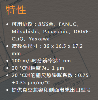 BiSS C:分辨率為50 nm、5 nm和1 nm DRIVE-CLiQ?、FANUC和Mitsubishi:分辨率為50 nm和1 nm Panasonic:分辨率為100 nm、50 nm和1 nm Yaskawa:分辨率為50 nm和1 nm |