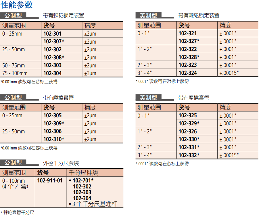 帶一套基準桿(除0-25mm/0-1" 型)。
