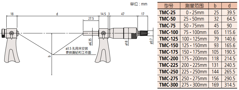 ? TMC-MX 是防護等級為 IP65 的防水型可更 換式 Digimatic 螺紋千分尺。