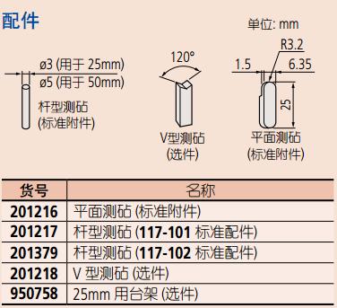 ? 平面測(cè)砧(201216)和桿型測(cè)砧: 直徑為3mm的桿型測(cè)砧(201217)適 于0 -25mm型, 直徑為5mm的桿型測(cè)砧(201379)適于25-50mm型。