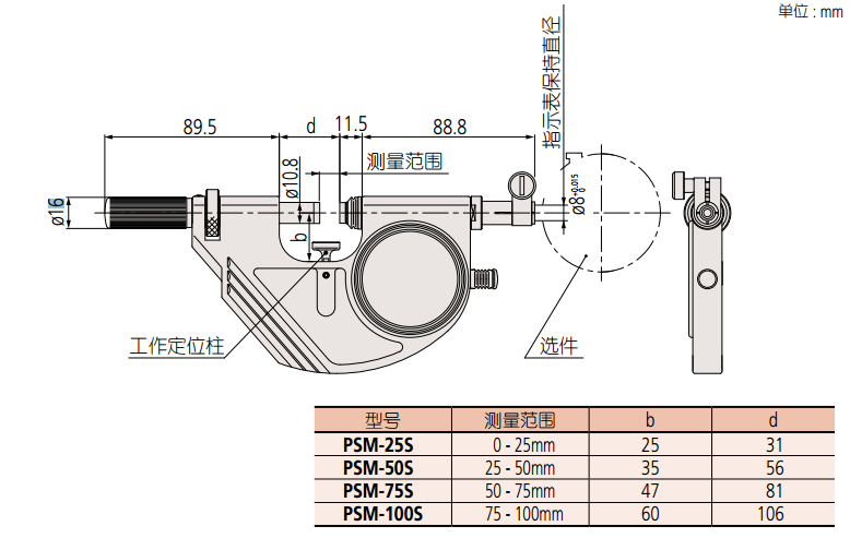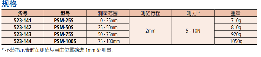 * 不裝指示表時在測砧從自由位置縮進 1mm 處測量。