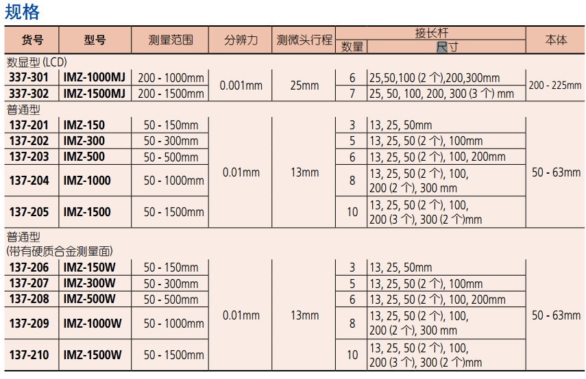 ? 兩種測量面可選,帶硬質(zhì)合金頭和不帶硬質(zhì) 合金頭 (337-301/302 僅適用于帶硬質(zhì)合金頭)