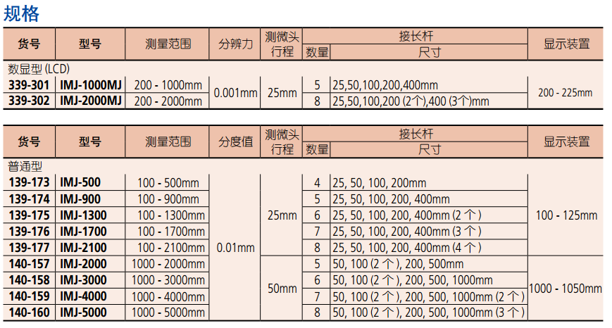 140系列精度:±(7+接桿數(shù) + *大測(cè)量長(zhǎng)度/50 )μm (小數(shù)圓整)