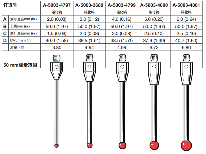 對于需要較大剛性的小直徑測桿或短測桿(長度不超過50 mm),使用碳化鎢是很好的選擇,小直徑測桿可用于測球直徑為1 mm或更小的測針。除此之外,測桿重量將帶來負(fù)面影響,而且由于桿與本體之間的接頭可能發(fā)生偏折,因此剛性也可能降低。
