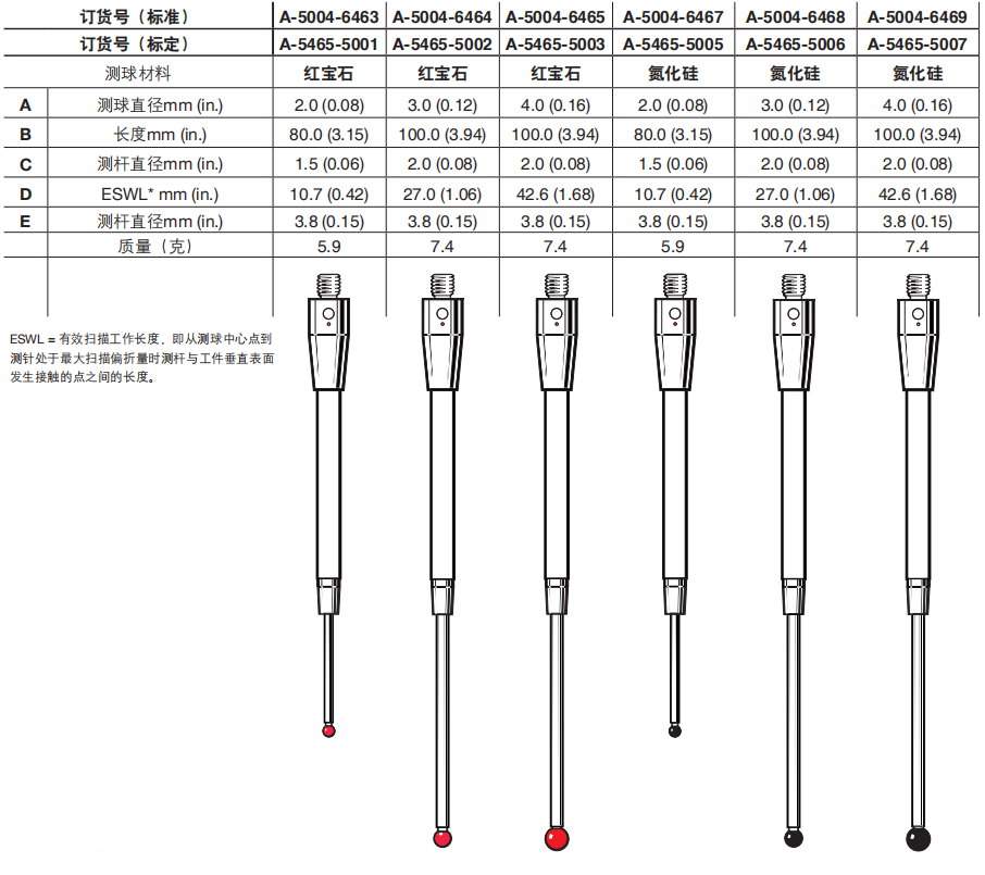 雷尼紹M2螺紋直測(cè)針(紅寶石球,碳化鎢測(cè)桿)