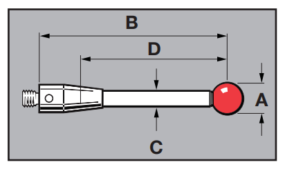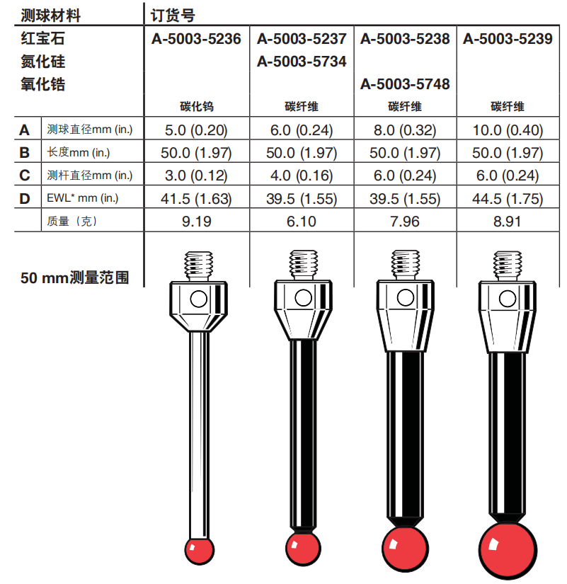 M5 ?5 mm紅寶石測(cè)球,碳化鎢測(cè)桿,長(zhǎng)度50 mm,產(chǎn)品代碼: A-5003-5236