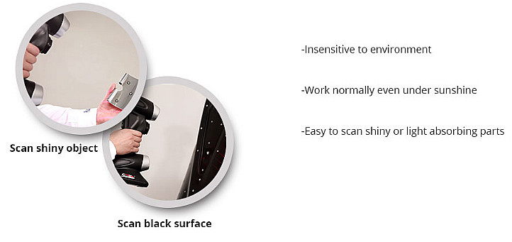 ? 動態(tài)參考:使用光學反射靶來形成鎖定至部件自身的參考系統(tǒng),使用戶可以在掃描期間按自己需要的方式移動物體