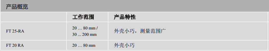 FT 25-RA -- 微型測距傳感器,精密的微型測距傳感器用于測量和控制任務(wù) 。除了模擬量電壓輸出,此測距傳感器還可設(shè)置一個(gè)開關(guān)量及通過兩個(gè)開關(guān)點(diǎn)設(shè)置一個(gè)距離開關(guān)量的上下界限。