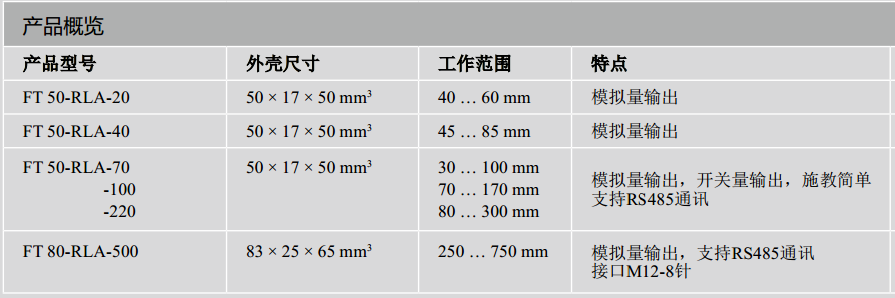 | 40 μm | 3 ms | 2 ms | +] | 接口, M12×1, 4-針 | FT 50 RLA-20-F-L4S | 574-41005 |