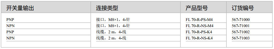 FL70-RA-…D:FL70-RA-…D系列傳感器除了擁有以上的功能外,還具有一個模擬量輸出功能,在復(fù)雜的應(yīng)用上有更大的優(yōu)勢,如應(yīng)用在截面轉(zhuǎn)換器上。因此,該系列傳感器可以完成基于物體大小和輪廓的檢測和控制。