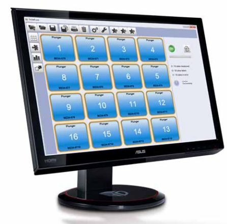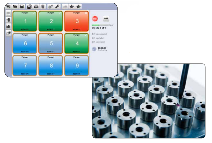 一個(gè)具有可配置托盤布局的簡(jiǎn)單用戶界面,允許用戶觸摸測(cè)程序的一個(gè)按鈕來(lái)啟動(dòng)和停止。判斷零件可以根據(jù)簡(jiǎn)單的綠色、紅色和琥珀色系統(tǒng)顯示來(lái)識(shí)別通過(guò)、失敗或測(cè)量警告。