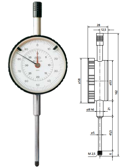大量程機械指示表810 SV,大測量范圍,.量程40mm .堅固的測量桿(直徑5mm) ·通過頂部提升保護帽提升測量桿