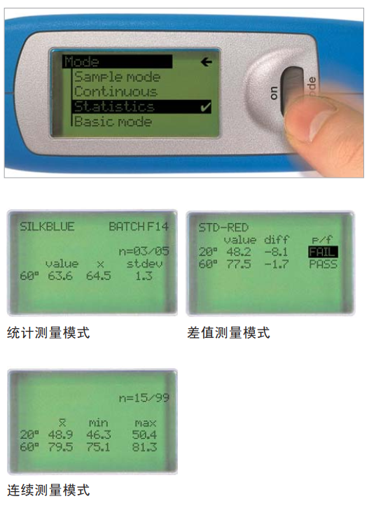 所有被選擇的角度在同一個(gè)點(diǎn)上測(cè)量,并立即顯示測(cè)量結(jié) 果一包括:差值、合格/不合格和統(tǒng)計(jì)結(jié)果。 微型三角度光澤儀具有新一代儀器的所有功能,使用得心 應(yīng)手。